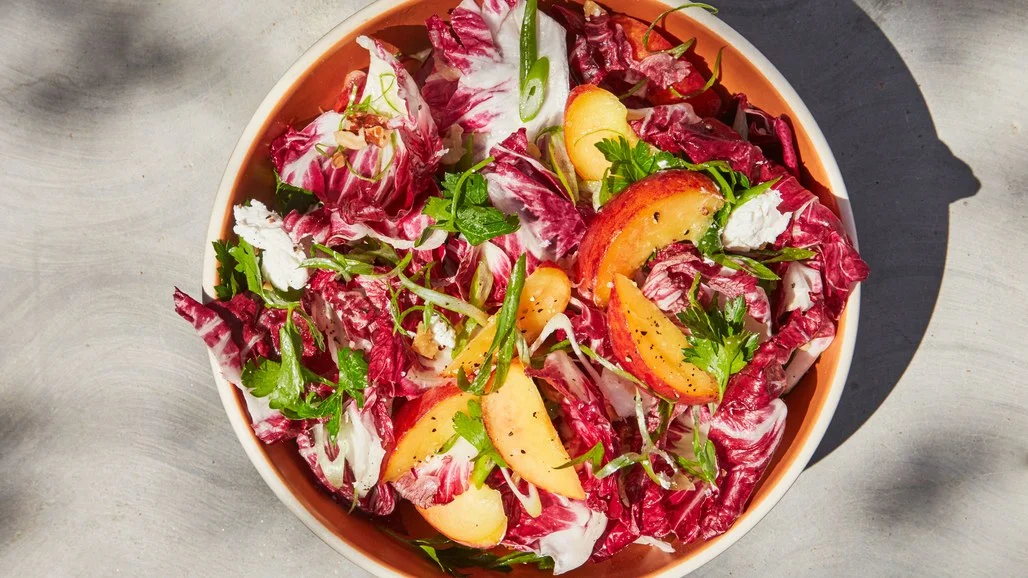 - In a big bowl, combine radicchio, peaches, scallions, parsley, and nuts. Drizzle in oil and lemon juice (and zest if you have it), season with salt.